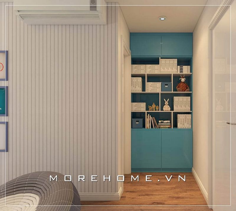 . Tủ quần áo gỗ công nghiệp có lối thiết kế kịch trần và có nhiều ngăn, giúp bé trai có thêm nhiều không gian để lưu trữ đồ dùng, quần áo cá nhân của mình.